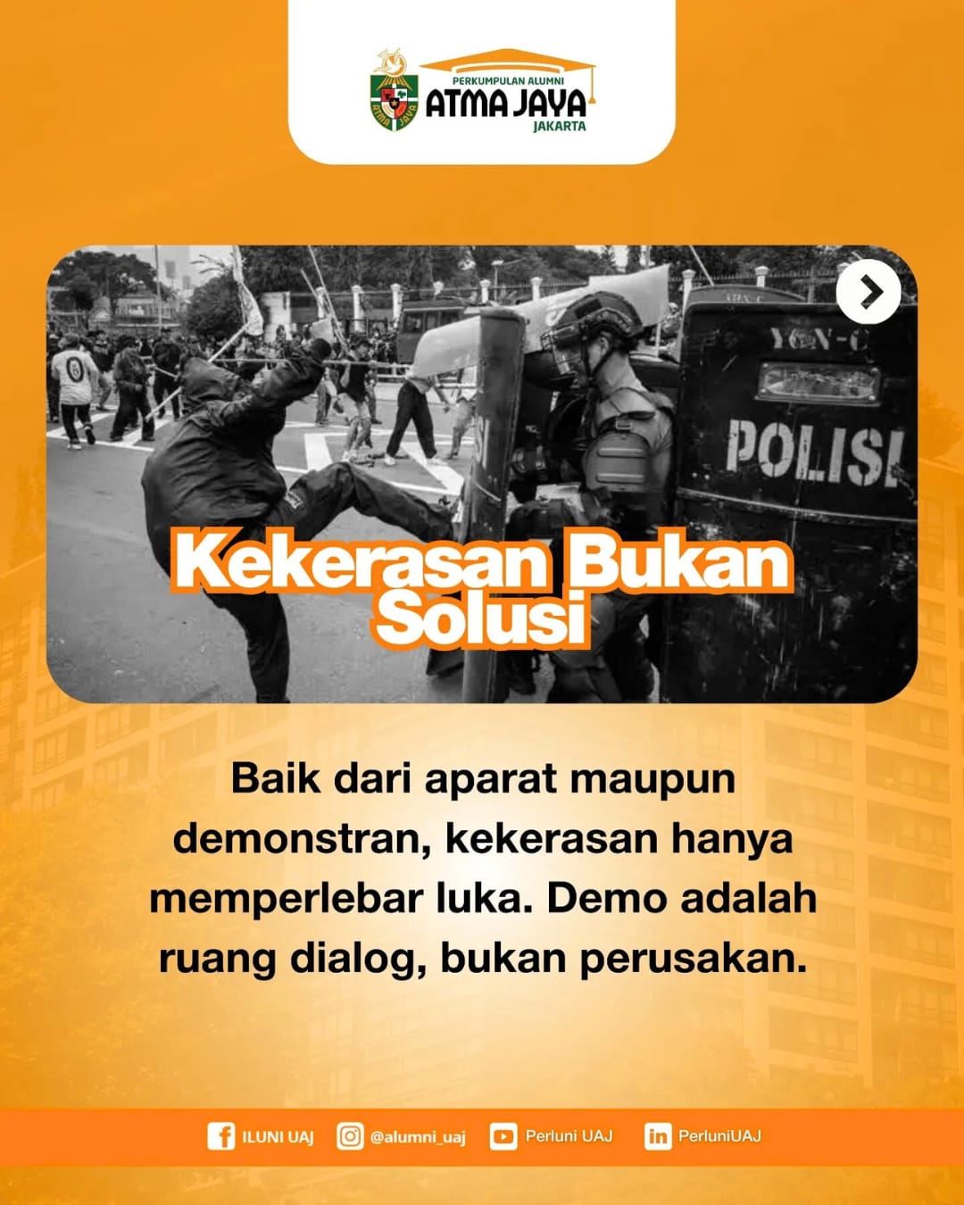 Perluni UAJ mengecam setiap bentuk kekerasan dalam unjuk rasa, baik yang dilakukan oleh aparat maupun pihak demonstran. Insiden berujung fatal seperti kematian Affan hanya akan memperlebar luka dan memperlemah ikatan kebangsaan kita. Demo harusnya menjadi ruang dialog, bukan alat perusakan.